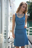 Tailored denim dress, with an all over outline design.