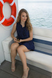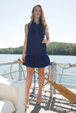 Navy shift dress with lower flounce, and double tassels at the neck.